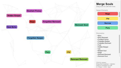 Every merge is permanent. Every discovery expands your collection. Over time, your screen becomes a living constellation of spirits linked by your own experimentation. Drop unwanted souls into the sidebar to make room for new ideas, or fill the entire canvas with your creations. The game never stops you.